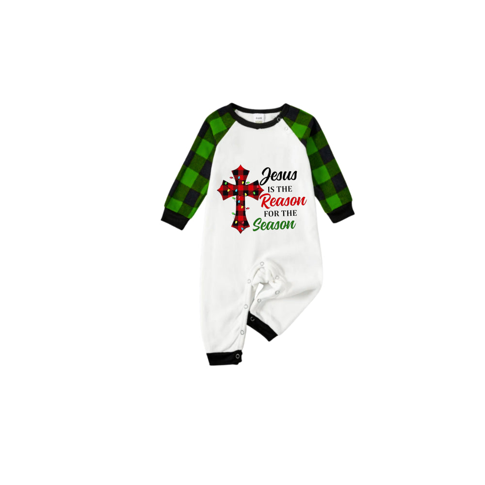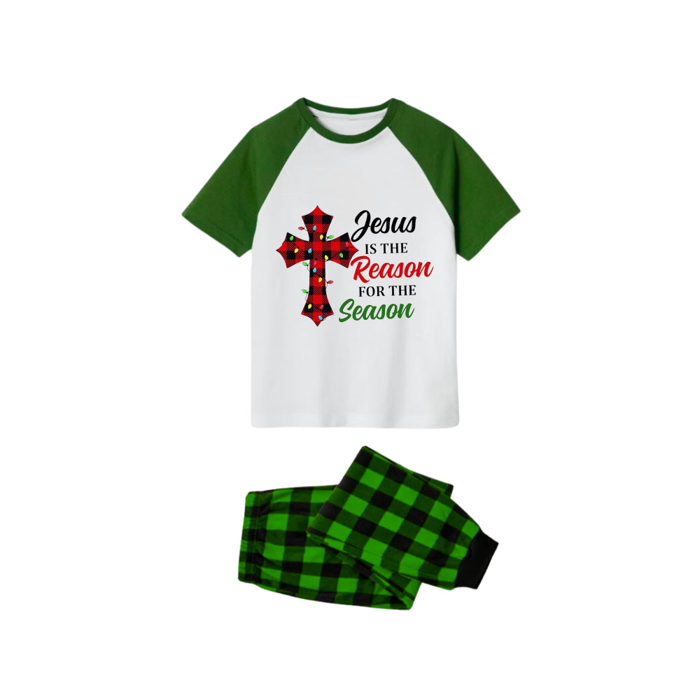 White Top Green Sleeves Green Plaid Pants Pajamas Set With "Jesus Is The Reason For The Season" Slogan Print