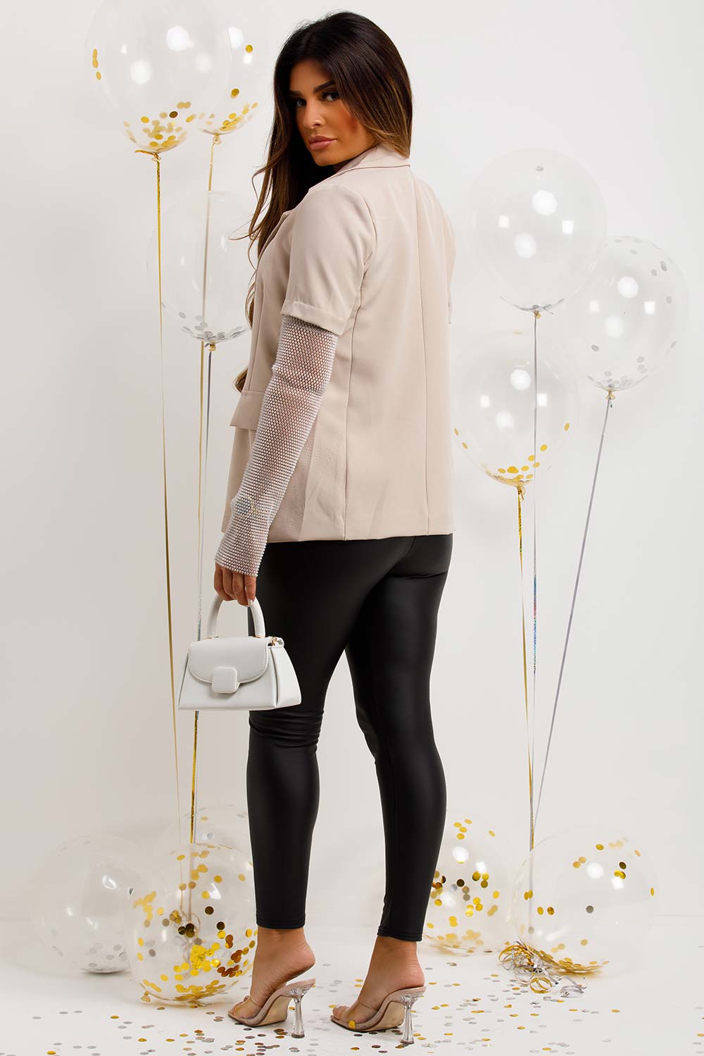 Blazer with diamante net sleeve. This blazer jacket is going to take your look to the next level effortlessly. Featuring blazer jacket with diamante net chainmail sleeve detail. Style this diamante sleeve blazer with our leather look leggings to complete the outstanding looks. This blazer jacket is also available in other colours.